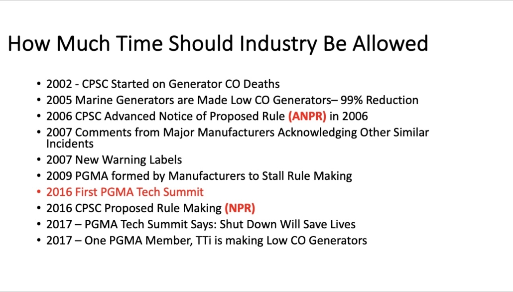Proposed CPSC Generator Carbon Monoxide Rule had been in process from 2002 until I testified on its behalf in 2017. It started with a study in 2002. In 2009, the generator manufacturers created a manufacturers association to try to head off this rule, the PGMA.